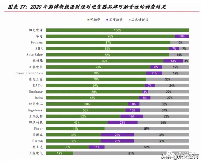 2020年彭博新能源財(cái)經(jīng)通過向可再生能源項(xiàng)目的投資方發(fā)放問卷等形式,對(duì)逆變器品牌的可融資性進(jìn)行了調(diào)查。排名較高的品牌意味著更易幫助項(xiàng)目開發(fā)商獲得銀行融資,利于綁定長(zhǎng)期客戶群體;另一方面說明該品牌逆變器在產(chǎn)品質(zhì)量、運(yùn)行表現(xiàn)、售后服務(wù)支持和長(zhǎng)期可靠性方面表現(xiàn)突出,利于海外布局的拓展。陽光電源以100%的得票率當(dāng)選“全球最具融資價(jià)值的逆變器品牌”,華為位居第2名,共有9家中國企業(yè)上榜。重要的是,該調(diào)查結(jié)果展現(xiàn)出國內(nèi)逆變器企業(yè)在海外擴(kuò)張業(yè)務(wù)的過程中,品牌價(jià)值得到提升,逐步得到海外投資方的認(rèn)可。