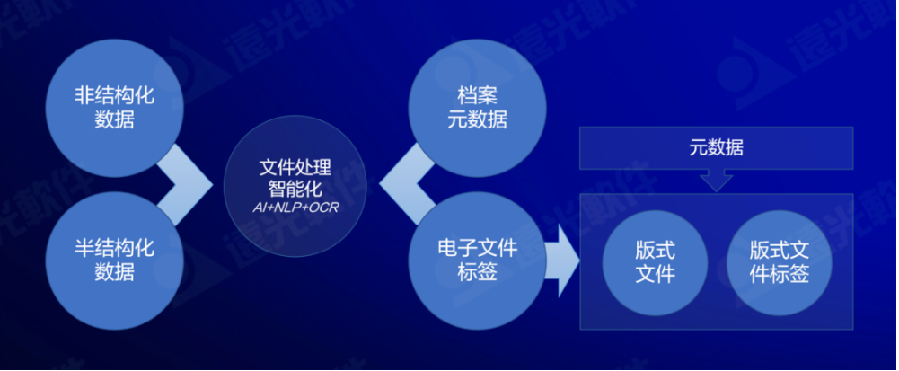 此外,還通過人工智能技術(shù),賦予機器理解文檔的能力,自動從海量非結(jié)構(gòu)化文檔中提取出結(jié)構(gòu)化信息,生成檔案元數(shù)據(jù),給歸檔文件自動打標簽,提供檔案管理的多維信息,滿足電子檔案智能保管、高效利用的場景需求,實現(xiàn)歸檔文件的智能化處理。
