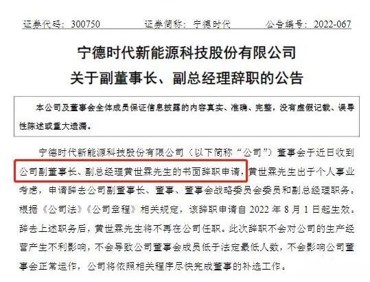 8月1日晚間,寧德時(shí)代披露公告稱,公司董事會(huì)于近日收到公司副董事長(zhǎng)、副總經(jīng)理黃世霖的書(shū)面辭職申請(qǐng),黃世霖出于個(gè)人事業(yè)考慮,申請(qǐng)辭去公司副董事長(zhǎng)、董事、董事會(huì)戰(zhàn)略委員會(huì)委員和副總經(jīng)理職務(wù)。辭去上述職務(wù)后,黃世霖將不再在公司任職。