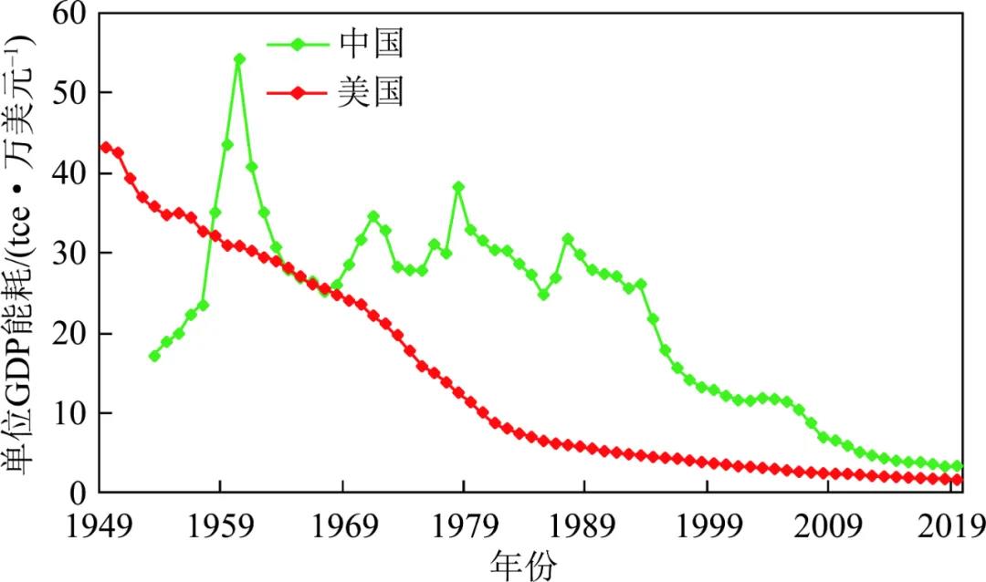 美國能源消費(fèi)碳排放強(qiáng)度在碳達(dá)峰前期、達(dá)峰期下降幅度較小,實現(xiàn)碳達(dá)峰核心是提高能源效率,降低單位GDP能耗,在不大幅度增加能源消費(fèi)的前提下,支撐經(jīng)濟(jì)增長。2019年美國單位GDP能耗僅相當(dāng)于1949年的3.9%。