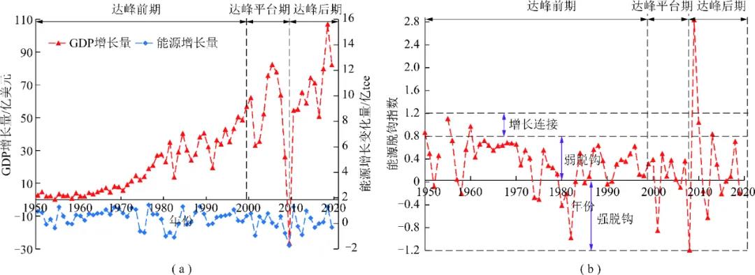 研究人員根據(jù)現(xiàn)代化進(jìn)程、能源消費(fèi)和碳排放趨勢,將美國碳排放分三個階段:即碳達(dá)峰前期(1949—1999年)、碳達(dá)峰平臺期(2000—2008年)、碳達(dá)峰后期(2009年至今)。依據(jù)Tapio彈性分析法對美國能源消耗與GDP增長的脫鉤程度進(jìn)行定量分析后,得到如下認(rèn)識: