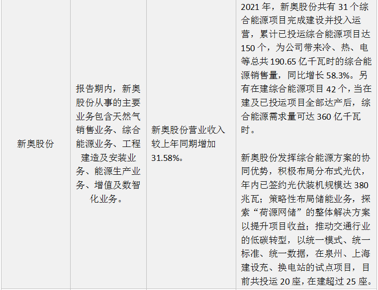 新奧股份2021年年度報(bào)告顯示,報(bào)告期內(nèi),公司營(yíng)業(yè)收入較上年同期增加31.58%,主要是公司所屬子公司天然氣業(yè)務(wù)(零售、批發(fā)、直銷(xiāo))氣量增加、單價(jià)上漲,以及綜合能源業(yè)務(wù)快速增長(zhǎng)所致。在綜合能源業(yè)務(wù)方面,新奧股份重點(diǎn)開(kāi)發(fā)低碳園區(qū)、低碳工廠、低碳建筑、低碳交通四大類(lèi)客戶,以綠色低碳整體解決方案切入,大力發(fā)展終端節(jié)能、工藝優(yōu)化、能源設(shè)施托管運(yùn)營(yíng)等用能側(cè)服務(wù)業(yè)務(wù)。