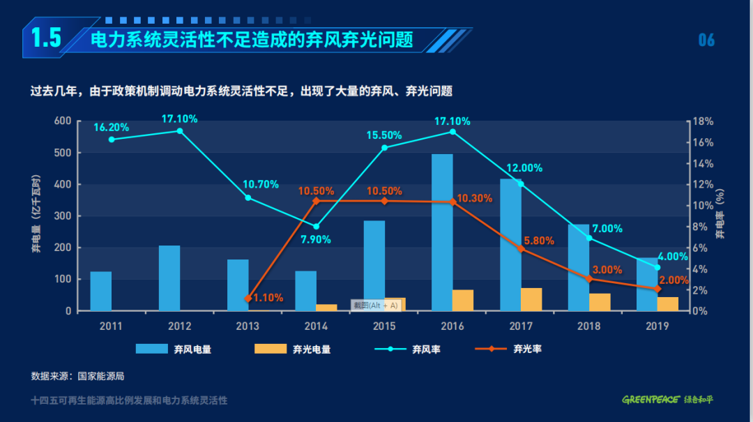 目前,中國以煤電為主的電力系統(tǒng)靈活性嚴(yán)重不足,電力系統(tǒng)的僵化導(dǎo)致了棄風(fēng)、棄光問題的出現(xiàn)。2011-2019年,中國的棄風(fēng)和棄光率一度高達(dá)17.1%和10.5%,造成了大量發(fā)電資源的浪費(fèi)。2016-2018年間,中國棄風(fēng)和棄光電量共計(jì)1389億千瓦時(shí) ,相當(dāng)于約3000萬千瓦煤電廠的發(fā)電量。