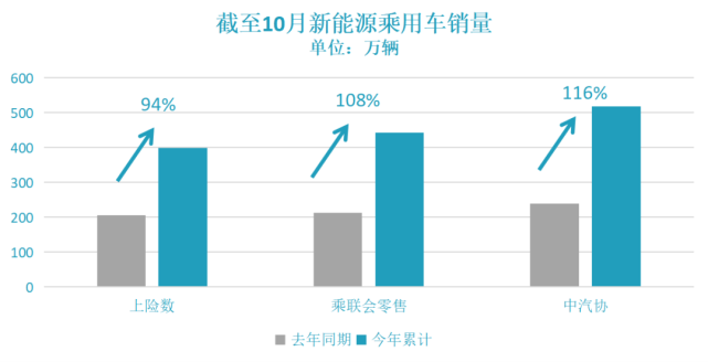 終端統(tǒng)計的上險數(shù)更為直接反映了市場狀況,1-10月總上險新能源乘用車399.47萬輛,同比增幅也達到了94%。