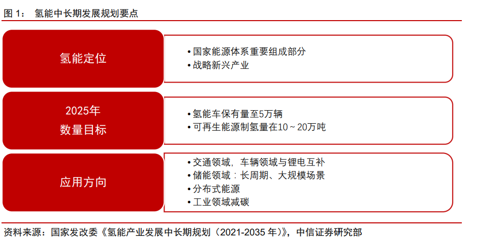 行業(yè)中長期規(guī)劃對投資而言主要有三大核心要點,包括氫能定位、未來發(fā)展目標(biāo)以及應(yīng)用方向。