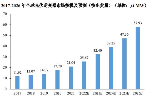 受益于各國對新能源的推廣,全球光伏新增裝機容量 GW 級市場持續(xù)增大,帶動光伏逆變器需求快速增加。2017-2021 年,全球光伏逆變器市場規(guī)模逐年增長,期間年復合增長率為 15.26%,2021 年全球光伏逆變器市場規(guī)模達 21.04 萬MW,預計 2026 年將穩(wěn)定增長至 57.93 萬 MW。