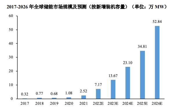 近年,隨著儲能成本的下降、儲能技術(shù)的進步,儲能在全球范圍內(nèi)受重視程度不斷提高,裝機容量逐年提升,據(jù)弗若斯特沙利文數(shù)據(jù),2021 年全球儲能市場規(guī)模達到 2.52 萬 MW,并預計于 2026 年進一步增加至 52.84 萬 MW,期間年復合增長率預計達到 83.8%。
