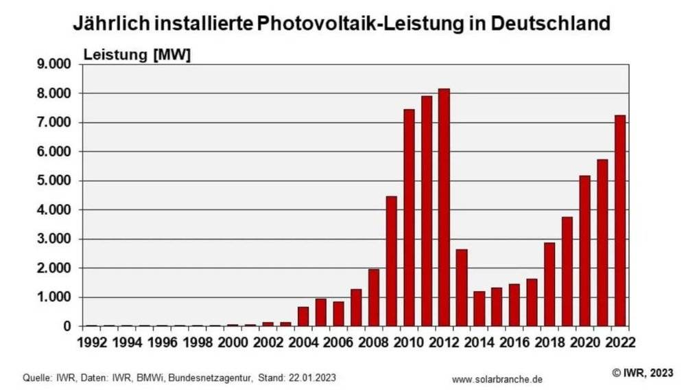 德國過去三十年歷年光伏裝機(jī)量,這里可更直觀地看出其直至2022年也沒有恢復(fù)到2010-2012年巔峰期的7.5-8GW。來源同上。