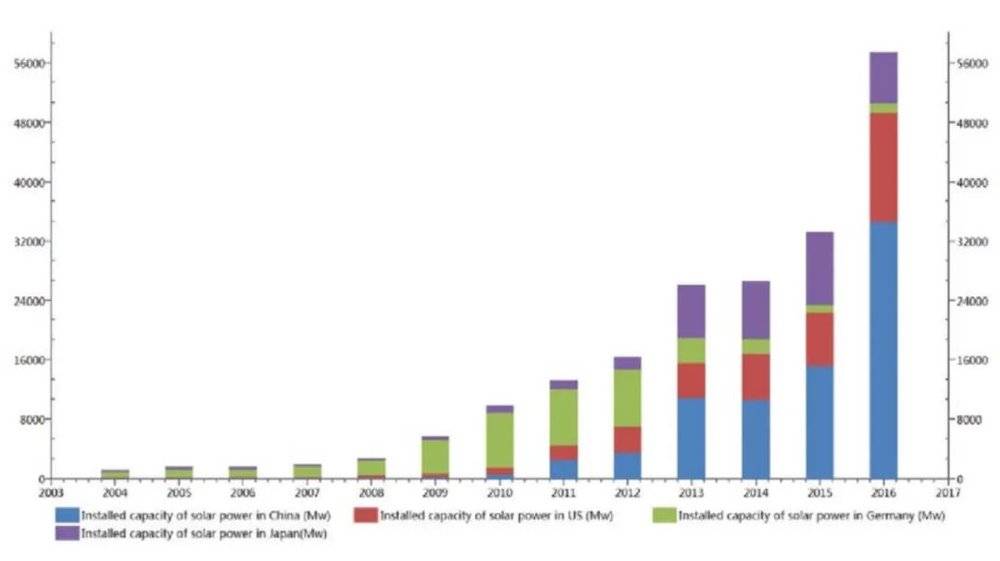 2015年中國超越了德國成為全球光伏累計(jì)裝機(jī)量最大國,目前已在全球一騎絕塵。圖中藍(lán)色表示中國,綠色表示德國。