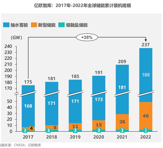 根據(jù)CNESA數(shù)據(jù),截至2021年底,全球已投運(yùn)的(電力)儲能項(xiàng)目累計(jì)裝機(jī)規(guī)模 209.4GW,相較于五年前增長19%。抽水蓄能占比高,漲幅較小;儲能的增長幾乎全部來自于新型儲能,五年間占比已達(dá)12.2%。其中電化學(xué)儲能為增長主力軍,從2017年的2.9GW增長至如今的23GW,占據(jù)新型儲能市場90%以上的份額。