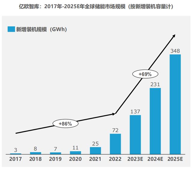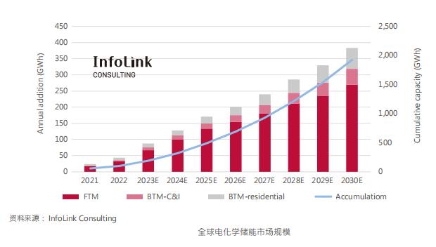根據(jù)InfoLink資料庫統(tǒng)計(jì),2022年全球電化學(xué)儲能新增16.2GW/44GWh,其中以中國新增約34%占整體成長速度最快,其次為美國、歐洲、日本、韓國、澳大利亞等,光是上述國家2022年儲能新增總和占全球超過市場九成份額,因此累計(jì)至2022年底,電化學(xué)儲能全球累計(jì)安裝量為41GW/98.8GWh,之中約有16-17GWh搭配光伏系統(tǒng),InfoLink估計(jì)光加儲占比將會(huì)因政策及再生能源發(fā)展而逐年提升比重,此外,盡管現(xiàn)在儲能增長速度每年已經(jīng)以倍數(shù)成長,估計(jì)到2025年國際電芯廠紛紛擴(kuò)產(chǎn)之后,儲能系統(tǒng)會(huì)因電池價(jià)格下降因而再加速建置速度,預(yù)計(jì)2025年全球電化學(xué)儲能市場有望超過100GWh,而2030年全球樂觀有望累積建置 250GWh。