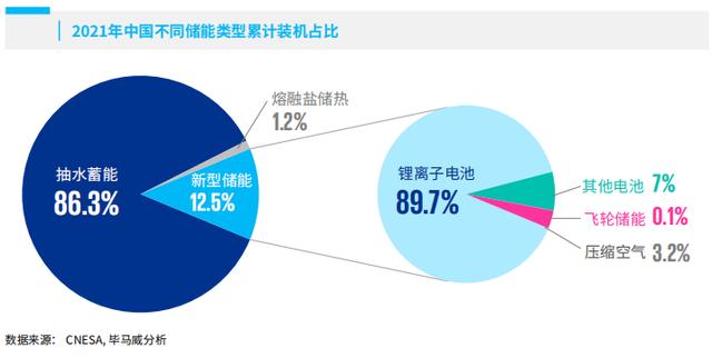 根據(jù)CNESA數(shù)據(jù),2021年中國儲能市場中不同類型儲能方式的占比與全球基本保持一致。其中抽水蓄能仍是最主要的儲能方式,占比86.3%,與全球86.2%的占比持平;但抽水蓄能電站的建設(shè)受地形因素限制較大,且建設(shè)周期較長,通常需要7年左右,未來隨著電化學(xué)儲能等新型儲能造價(jià)的下降,抽水蓄能在電力系統(tǒng)中的發(fā)展空間可能受限。新型儲能方式占比12.5%,高于全球0.3個(gè)百分點(diǎn)。電化學(xué)儲能為最主要的新型儲能方式,占比96.7%,比全球占比略低一個(gè)百分點(diǎn),鋰離子電池占據(jù)主流。