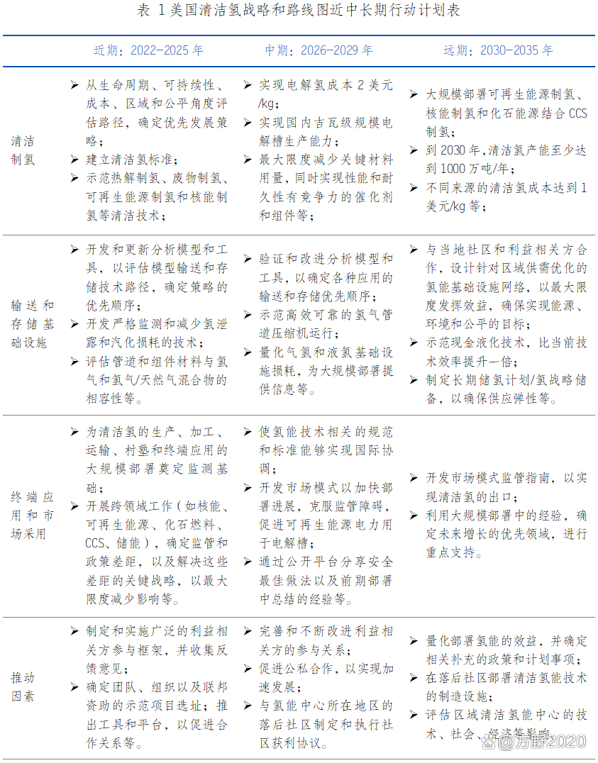 美國(guó)是最早發(fā)展氫能的國(guó)家,多年來始終將氫能作為重要能源戰(zhàn)略儲(chǔ)備技術(shù),持續(xù)支持氫能全產(chǎn)業(yè)鏈技術(shù)研發(fā),并加快示范創(chuàng)建和戰(zhàn)略部署,以期實(shí)氫能產(chǎn)業(yè)規(guī)?;l(fā)展。2021年7月美國(guó)能源部(以下簡(jiǎn)稱“DOE”)宣布投資5250萬(wàn)美元用于綠氫技術(shù)的研發(fā),這筆資金將惠及多項(xiàng)氫能研發(fā)項(xiàng)目,旨在十年內(nèi)將氫能成本降低80%,達(dá)到每千克1美元。11月DOE又發(fā)布《碳中性氫能技術(shù)基礎(chǔ)科學(xué)》研發(fā)指南,明確了高效新型電解水制氫、氫機(jī)理等4個(gè)優(yōu)先研發(fā)方向。2022年2月,DOE下屬化石能源和碳管理辦公室宣布2800萬(wàn)美元的聯(lián)邦資金,用于推動(dòng)綠氫作為一種無碳燃料用于交通、工業(yè)和電力生產(chǎn)。2022年11月,DOE發(fā)布《國(guó)家清潔氫能戰(zhàn)略和路線圖(草案)》,制定2022-2035年近、中、長(zhǎng)期清潔氫能發(fā)展行動(dòng)時(shí)間表,如表1所示,明確在制氫、儲(chǔ)氫、運(yùn)氫及終端應(yīng)用的各階段發(fā)展目標(biāo)。此外,美國(guó)于2023年6月發(fā)布首個(gè)國(guó)家能源戰(zhàn)略規(guī)劃路線圖。