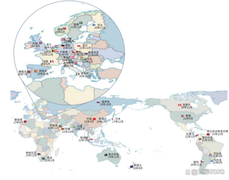 氫能是一種來源豐富、綠色低碳、應(yīng)用廣泛的二次能源,正逐步成為全球應(yīng)對(duì)氣候變化和能源轉(zhuǎn)型發(fā)展的重要抓手。隨著全球新一輪科技革命和產(chǎn)業(yè)變革蓬勃興起,新興能源技術(shù)以前所未有的速度加快迭代,助推氫能產(chǎn)業(yè)快速發(fā)展。據(jù)國(guó)際氫能源委員會(huì)預(yù)測(cè),到2030年全球氫能領(lǐng)域投資總額將達(dá)5000億美元,而2050年全球氫能產(chǎn)業(yè)鏈產(chǎn)值將超過2.5萬(wàn)億美元。在此背景下,目前已有超過40多個(gè)國(guó)家和地區(qū)制定了國(guó)家氫能發(fā)展戰(zhàn)略,積極培育氫能及燃料電池技術(shù)攻關(guān)和產(chǎn)業(yè)發(fā)展,如圖1所示。在推動(dòng)氫能發(fā)展的過程中,各國(guó)根據(jù)自身資源稟賦、產(chǎn)業(yè)基礎(chǔ)、市場(chǎng)訴求等因素,分階段、分領(lǐng)域推進(jìn)氫能發(fā)展戰(zhàn)略,并在實(shí)踐中不斷完善,已經(jīng)形成各具特色的發(fā)展模式。