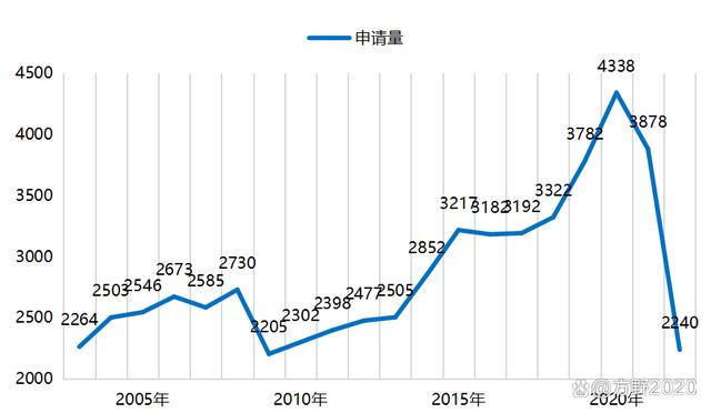 本報(bào)告專利文獻(xiàn)數(shù)據(jù)均來自INCOPAT全球?qū)@麛?shù)據(jù)庫(kù),本節(jié)車用氫能專利檢索數(shù)據(jù)采集時(shí)間段為2003年1月1日至2022年12月31日,涵蓋了整車集成、質(zhì)子交換膜燃料電池系統(tǒng)以及氫內(nèi)燃機(jī)相關(guān)的專利技術(shù),專利申請(qǐng)趨勢(shì)如圖4所示??傆?jì)專利數(shù)據(jù)57191條,其中以簡(jiǎn)單同族合并方式處理后共計(jì)41338件。
