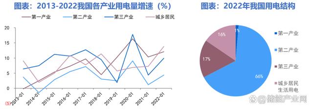 第三產(chǎn)業(yè)和居民用電增速快于工業(yè),負荷峰值增速大于用電量增速。近十年以來,我國第二產(chǎn)業(yè)增速相對較低,在用電結(jié)構(gòu)占比明顯降低,從2013年的73%下降至2022年的66%,第三產(chǎn)業(yè)和城鄉(xiāng)居民生活用電占比之和則由2013年的25%提高至2022年的33%。