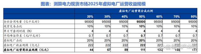 測算得到,通過電力現(xiàn)貨市場獲利模式下,當虛擬電廠運營商分成比例為50%時,虛擬電廠2025年運營市場規(guī)模為111億元。