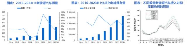 充電樁保有量隨新能源汽車快速提升,改變配電網(wǎng)形態(tài)。截至2023H1,我國公共充電樁保有量為214.86萬臺,同比+40.63%。2023H1,新能源汽車銷量同比+44.13%,保持快速增長,可以預見未來隨新能源汽車銷量繼續(xù)快速提升,充電樁保有量將持續(xù)增加。充電樁的大量增加將對配電網(wǎng)產(chǎn)生沖擊,相比于常規(guī)交流充電樁,快充直流樁由于功率更大、充電時間更短,產(chǎn)生沖擊更大。