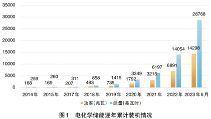 近年來,電化學儲能呈現(xiàn)爆發(fā)式增長,根據(jù)《統(tǒng)計數(shù)據(jù)》,2023年上半年,新增投運電化學儲能電站227座、總功率7.41吉瓦、總能量14.71吉瓦時,新增規(guī)模創(chuàng)歷史新高,超過此前歷年累計裝機規(guī)??偤?見圖1)。此外,目前在建電化學儲能電站325座、總功率12.92吉瓦、總能量30.49吉瓦時,按照電化學儲能電站建設(shè)周期一般6~8個月計算,在不計新增項目的情況下,2023年下半年新增裝機規(guī)模也將翻一番,提前兩年完成“十四五”規(guī)劃裝機目標(國家發(fā)改委、國家能源局《關(guān)于加快推動新型儲能發(fā)展的指導意見》中提到,2025年新型儲能裝機規(guī)模達3000萬千瓦以上)。