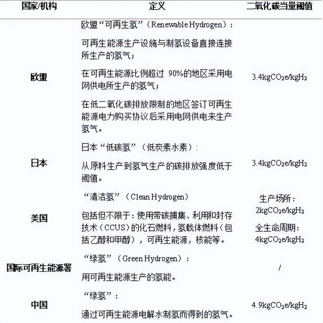 2020年12月29日,國(guó)內(nèi)行業(yè)組織提出《低碳?xì)洹⑶鍧崥渑c可再生能源氫的標(biāo)準(zhǔn)與評(píng)價(jià)》,當(dāng)中指出在單位氫氣碳排放量方面,低碳?xì)涞拈撝禐?4.51千克二氧化碳當(dāng)量/千克氫,清潔氫和可再生氫的閾值為4.9千克二氧化碳當(dāng)量/千克氫,同時(shí)可再生氫要求其制氫能源為可再生能源。
