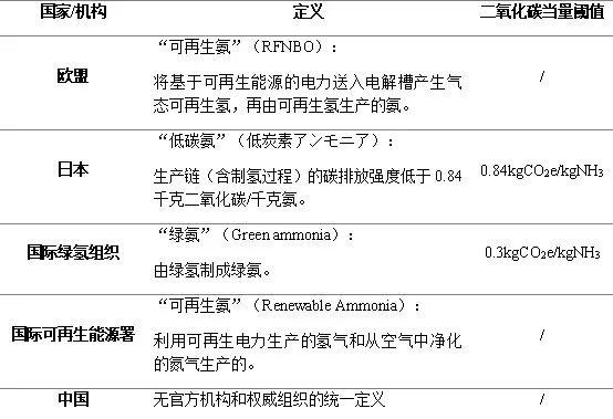 目前,國(guó)內(nèi)關(guān)于“綠氨”尚無(wú)官方機(jī)構(gòu)和權(quán)威組織的統(tǒng)一定義。行業(yè)內(nèi)具備相關(guān)發(fā)聲,國(guó)內(nèi)企業(yè)對(duì)綠氨的定義主要關(guān)注其原料氫是否由可再生能源電力制取,對(duì)生產(chǎn)過(guò)程中的碳排沒(méi)有明確的要求。