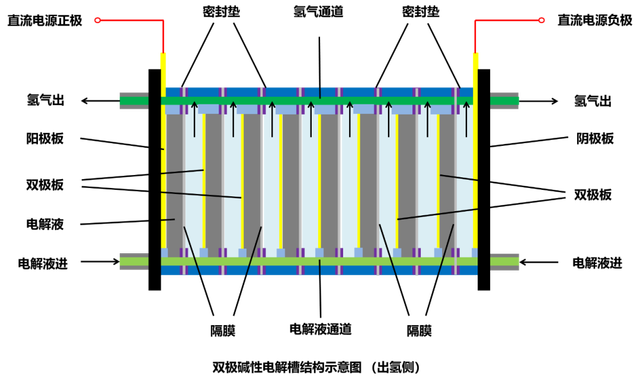 堿性電解水制氫系統(tǒng)主要包括堿性電解槽主體和輔助系統(tǒng)(BOP)。堿性電解槽主體由端壓板、密封墊、極板、電板、隔膜等零部件組裝而成,電解槽包括數(shù)十甚至上百個(gè)電解小室,由螺桿和端板把這些電解小室壓在一起形成圓柱狀或正方形,每個(gè)電解小室以相鄰的2個(gè)極板為分界,包括正負(fù)雙極板、陽極電極、隔膜、密封墊圈、陰極電極6個(gè)部分。