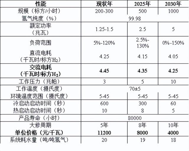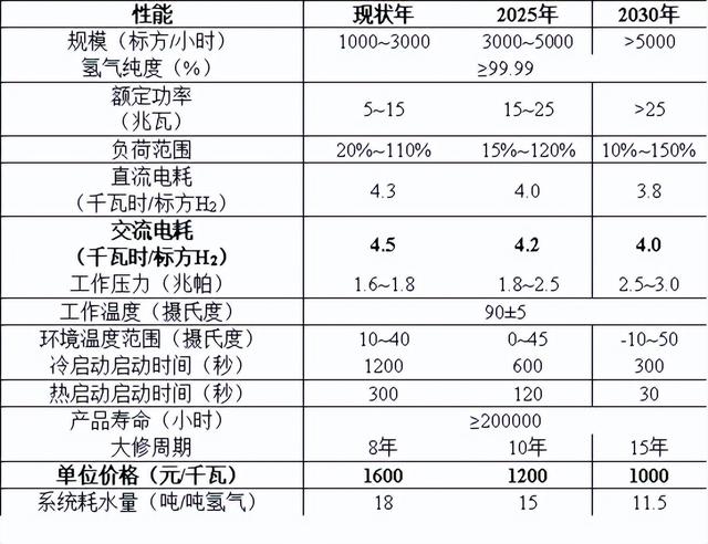 堿性電解槽主要成本構(gòu)成為電解電堆組件(45%)和系統(tǒng)輔機(jī)(55%);電解槽成本中55%是膜片及膜組件。依據(jù)行業(yè)內(nèi)多家主流廠商的數(shù)據(jù)分析,堿性電解槽的2025年及2030年的主要技術(shù)參數(shù)和投資水平如下: