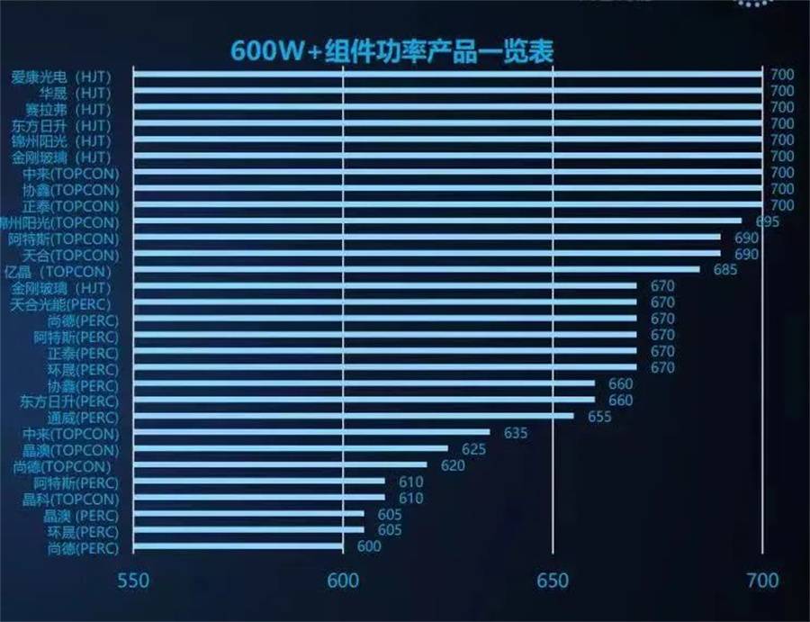 集邦新能源近期發(fā)布的一份行業(yè)報告則顯示,主流光伏企業(yè)已經(jīng)全面邁入600W+時代,而使用PERC、HJT、TOPCon等不同技術的600W+產(chǎn)品多達40余種。