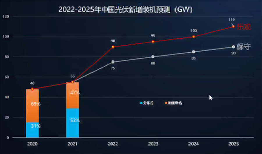根據(jù)中國光伏行業(yè)協(xié)會(CPIA)則預估,2022-2025年,我國年均新增光伏裝機將達到83-100GW,系全球光伏第一大裝機國。