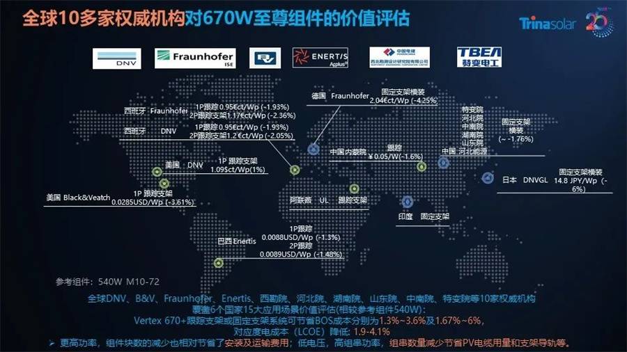 結果顯示,與市面上一般的540W組件相比,至尊670W組件最多可節(jié)省BOS成本6%,對應度電成本(LCOE)最多可降低4.1%。