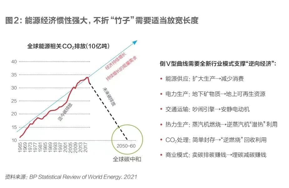 這個(gè)倒V型曲線需要全新的商業(yè)模式來(lái)支持逆向經(jīng)濟(jì),即所有的能源供應(yīng)、電力生產(chǎn)等都要反過(guò)來(lái),要從賣(mài)碳排碳賺錢(qián)的商業(yè)模式變成埋碳減碳賺錢(qián)的商業(yè)模式。