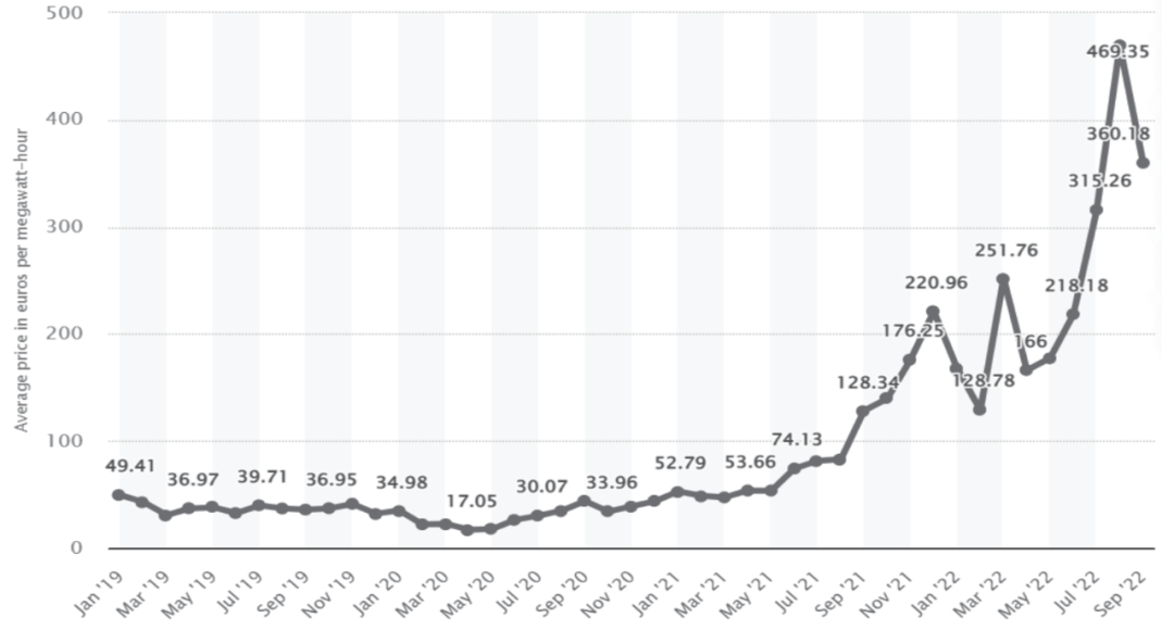 圖 2019—2022年德國(guó)電力批發(fā)價(jià)格月度走勢(shì)(單位:歐元/兆瓦時(shí))