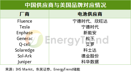 美國戶儲以本土品牌為主,中國供應商占比逐步提升。2021年美國戶用市場中,Tesla、BYD、Enphase分列前三,國內(nèi)產(chǎn)業(yè)鏈占比提升。特斯拉采用寧德100ah的方形電池;Enphase采用新能安52ah的軟包電池。