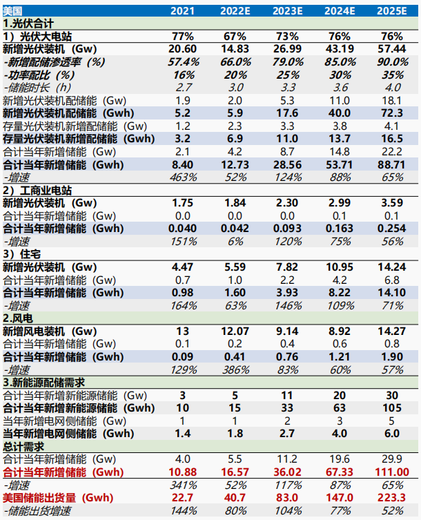 隨著多地儲能政策不斷出臺及市場機制日益完善,美國工商業(yè)儲能市場將逐步增長。綜上,預計2023年美國儲能市場總需求為36GWh,對應出貨量為83GWh,裝機/出貨同增117%/104%,到2025年裝機/出貨需求為111GWh/223GWh,2022-2025年裝機/出貨CAGR分別為88.5%/76.4%。