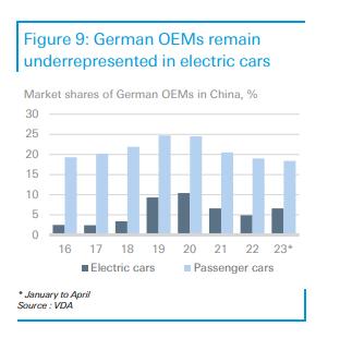 在中國,在2022年的汽車總銷量中電動汽車所占的市場份額接近28%(純電動汽車和插電式汽車)。德國品牌在中國電動汽車領域的市場份額相對較低(2022年僅為5 %)。中國制造商在更大程度上占據了中國市場。德國汽車制造商可能會繼續(xù)努力保護或擴大其在中國高端汽車領域的市場份額。對于德國汽車制造商來說,在量產車領域加劇競爭可能沒有什么意義,因為中國在規(guī)模經濟方面已經領先,而且消費者的接受程度可能已經太高了。