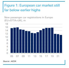 自2019年達到峰值以來,歐洲的新乘用車注冊量開始穩(wěn)步大幅下降。雖然當時有1580萬輛新乘用車注冊,但到2022年,這一數字僅為1130萬輛,下降了近29%。這種下降可以歸因于需求和供應方面的多重原因。