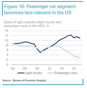 2022年,輕型車銷量(包括輕型卡車和乘用車)在美國下降了8%,約為1380萬輛。利率上升、供應鏈持續(xù)中斷和燃料價格上漲是造成這一現象的主要因素。前幾年,輕型車的銷量已經呈下降趨勢。新冠肺炎疫情導致2020年美國市場大幅下滑,至今仍未復蘇。