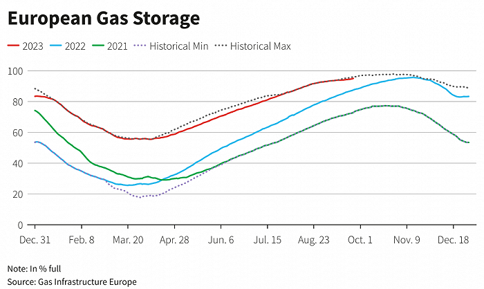 放在過去,沒有什么能夠比戰(zhàn)爭(zhēng)、罷工、停產(chǎn)這樣的突發(fā)事件更能影響能源等大宗商品價(jià)格的了。大宗商品商都會(huì)以此作為投資套利的工具。然而,即使罷工這樣的消息,也已經(jīng)無法動(dòng)搖經(jīng)歷過大風(fēng)大浪考驗(yàn)的歐洲天然氣的大勢(shì)。所以,《貿(mào)易經(jīng)濟(jì)學(xué)》同時(shí)指出,盡管天然氣價(jià)格出現(xiàn)短期上漲,但由于10月份天氣預(yù)測(cè)溫和、需求下降以及庫存水平較高,本周天然氣價(jià)格的整體趨勢(shì)顯示,下跌仍超過9%。目前,歐洲的儲(chǔ)氣設(shè)施容量已超過96%,并且仍在持續(xù)注入天然氣。另外,歐洲工業(yè)需求在不斷減少。以上這些都有助于維持相對(duì)穩(wěn)定的天然氣價(jià)格。
