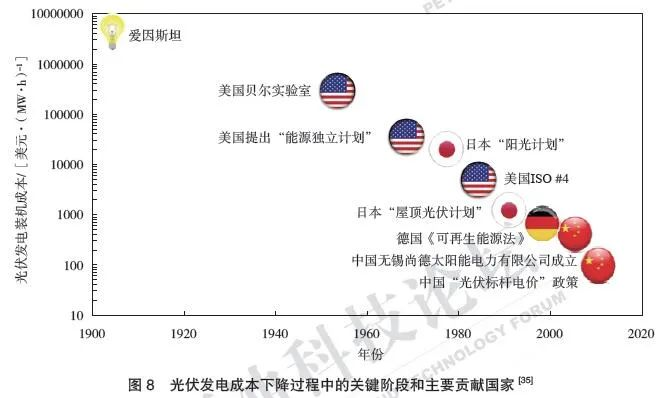 美國(guó)能源技術(shù)和公共政策學(xué)者Gregory F. Nemet于2019年出版著作《光伏如何變得便宜》(How Solar Became Cheap),書(shū)中介紹了光伏發(fā)電技術(shù)在歷史上的不同發(fā)展階段、成本變化的關(guān)鍵驅(qū)動(dòng)因素、關(guān)鍵國(guó)家對(duì)成本降低的貢獻(xiàn),以及光伏發(fā)電對(duì)其他低碳能源技術(shù)發(fā)展的經(jīng)驗(yàn)?zāi)P?。光伏發(fā)電的4個(gè)關(guān)鍵階段為:(1)20世紀(jì)50—70年代美國(guó)早期實(shí)驗(yàn)室研究,推動(dòng)每兆瓦時(shí)的裝機(jī)成本從10萬(wàn)美元級(jí)降到1萬(wàn)美元級(jí);(2)20世紀(jì)90年代的日本“屋頂光伏計(jì)劃”,推動(dòng)每兆瓦時(shí)裝機(jī)成本降至1000美元級(jí);(3)21世紀(jì)初德國(guó)《可再生能源法》的發(fā)布實(shí)施,推動(dòng)裝機(jī)成本降至1000美元/(MW·h)以下;(4)中國(guó)以“光伏標(biāo)桿電價(jià)”等強(qiáng)力政策推動(dòng)產(chǎn)業(yè)發(fā)展,促進(jìn)裝機(jī)成本降至100美元/(MW·h)以內(nèi)(圖8)。