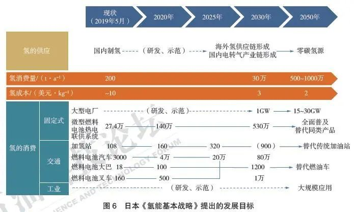 在能源消費(fèi)方面,2012—2016年,日本能源消費(fèi)總量減少了6.1%,接近實(shí)現(xiàn)2030年節(jié)能目標(biāo)所需的平均速度。日本能源轉(zhuǎn)型以氫能規(guī)?;脼轱@著特色和重要抓手,將氫能與電力和熱能并列定位為核心二次能源,并提出建設(shè)“氫能社會(huì)”的愿景,希望通過(guò)氫燃料電池實(shí)現(xiàn)氫能在家庭、工業(yè)、交通甚至全社會(huì)領(lǐng)域的應(yīng)用。日本在《氫能基本戰(zhàn)略》提出的主要發(fā)展目標(biāo)詳見(jiàn)圖6。