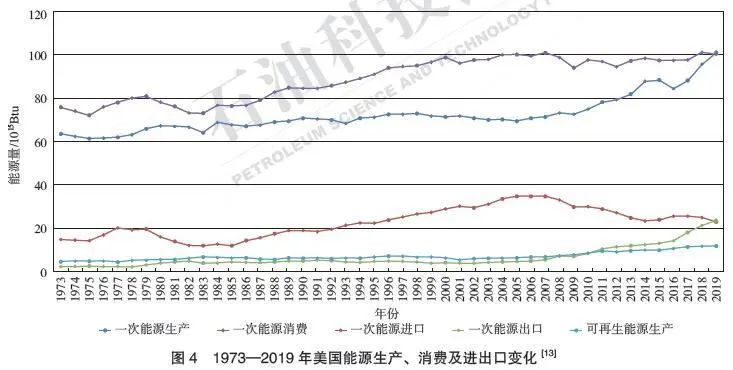 與歐洲的高比例可再生能源、激進(jìn)的碳減排目標(biāo)政策不同,美國(guó)能源轉(zhuǎn)型是在實(shí)現(xiàn)“能源獨(dú)立”的前提下推動(dòng)能源系統(tǒng)清潔化,以增加清潔能源(包括核電、可再生能源、天然氣和潔凈煤等)應(yīng)用比例為主要手段。2000年,美國(guó)和德國(guó)化石能源占一次能源消費(fèi)總量的比例分別是85%和88. 6%,從這一角度來(lái)看兩國(guó)能源轉(zhuǎn)型起點(diǎn)相似;2018年,美國(guó)和德國(guó)可再生能源在一次能源消費(fèi)量中所占比例分別為11.4%和16.6%,德國(guó)略勝一籌。縱觀1973年以來(lái)美國(guó)的能源生產(chǎn)、消費(fèi)和進(jìn)出口情況,自2005年起,美國(guó)可再生能源和核電產(chǎn)量快速增長(zhǎng),清潔能源消費(fèi)比例加速上升;2010以來(lái),一次能源產(chǎn)量快速增長(zhǎng),并在2019年實(shí)現(xiàn)了“能源獨(dú)立”(圖4)。