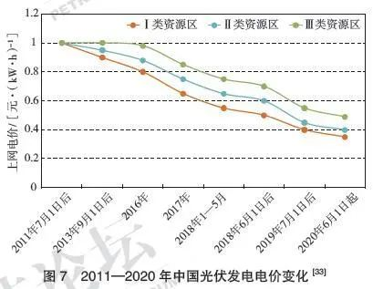 近年來(lái),在全球可再生能源成本迅速下降的過(guò)程中,除了政策支持和技術(shù)進(jìn)步以外,產(chǎn)業(yè)規(guī)模經(jīng)濟(jì)和規(guī)模效益是不容忽視的重要推力。中國(guó)得益于較為完備的基礎(chǔ)工業(yè)體系和龐大的市場(chǎng),在推動(dòng)風(fēng)電、光伏發(fā)電、生物質(zhì)發(fā)電、動(dòng)力電池、氫能利用等產(chǎn)業(yè)發(fā)展過(guò)程中,發(fā)揮了巨大的規(guī)模經(jīng)濟(jì)優(yōu)勢(shì)。2013年以來(lái),在國(guó)家政策的大力支持下,中國(guó)光伏發(fā)電產(chǎn)業(yè)不斷擴(kuò)大規(guī)模,迅速發(fā)展為全球最大的市場(chǎng),同時(shí)也擺脫了困擾光伏產(chǎn)業(yè)多年的“兩頭在外”的尷尬局面。2013—2018年,中國(guó)光伏裝機(jī)容量達(dá)到1.74×108kW,年復(fù)合增長(zhǎng)率超過(guò)73%,較2012年的0.065×108kW增長(zhǎng)26 倍。光伏發(fā)電上網(wǎng)電價(jià)從2011年的1元/(kW·h),下降到2020年的0.35~0.49 元/(kW·h)(2020年6月1日開(kāi)始實(shí)施)(圖7)。在這一過(guò)程中,國(guó)內(nèi)涌現(xiàn)出一批優(yōu)秀的光伏企業(yè),在2019全球光伏企業(yè)20強(qiáng)排行榜上有16家中國(guó)公司,前10名中有7家中國(guó)公司。