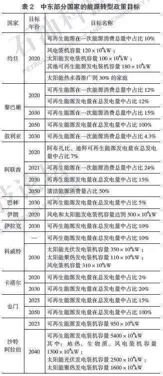 21世紀(jì)以來(lái),全球能源格局發(fā)生重大變化,以美國(guó)頁(yè)巖氣革命為代表的非常規(guī)油氣開(kāi)采量爆發(fā)式增長(zhǎng),可再生能源產(chǎn)業(yè)高速發(fā)展,全球能源消費(fèi)中心不斷向發(fā)展中國(guó)家轉(zhuǎn)移。這些因素促使中東國(guó)家對(duì)后石油時(shí)代進(jìn)行戰(zhàn)略思考。近年來(lái),推進(jìn)能源轉(zhuǎn)型、擴(kuò)大可再生能源應(yīng)用比例逐步進(jìn)入政府部門(mén)的視野,沙特阿拉伯、阿聯(lián)酋、卡塔爾、科威特等國(guó)相繼制定了多項(xiàng)政策目標(biāo)(表2)。