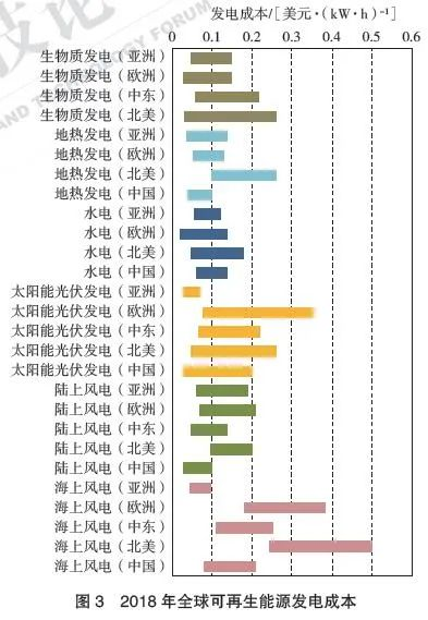 第三,可再生能源大規(guī)模開(kāi)發(fā)利用。風(fēng)力發(fā)電和太陽(yáng)能光伏發(fā)電成為全球成本下降最快、平均成本最低的可再生能源發(fā)電方式。2018年,除海上風(fēng)電以外,全球各地多種可再生能源發(fā)電技術(shù)的成本開(kāi)始具備較強(qiáng)的成本競(jìng)爭(zhēng)力(圖3)。在許多國(guó)家和地區(qū),可再生能源已開(kāi)始了對(duì)化石能源發(fā)電的存量替代。中國(guó)是世界上可再生能源利用規(guī)模最大、平均成本最低的國(guó)家,從2014年開(kāi)始,每年的風(fēng)電和太陽(yáng)能發(fā)電量均超過(guò)全社會(huì)新增用電量。