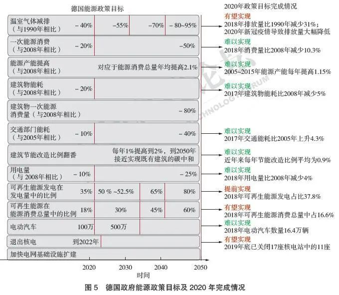德國(guó)能源資源稟賦不佳,除了煤炭?jī)?chǔ)量相對(duì)豐富外,石油和天然氣高度依賴進(jìn)口。德國(guó)能源轉(zhuǎn)型實(shí)踐始于21世紀(jì)初,確立了“能源安全、經(jīng)濟(jì)效率和環(huán)境可承受”的能源政策三大目標(biāo),核心思想是可持續(xù)發(fā)展。2000年,德國(guó)出臺(tái)《可再生能源法》,確定了可再生能源發(fā)展的多項(xiàng)激勵(lì)措施,并分別在2004年、2009年、2012年、2014年針對(duì)實(shí)際情況做出修訂和調(diào)整。2014年底,德國(guó)頒布《國(guó)家能效行動(dòng)計(jì)劃》,對(duì)能源消費(fèi)總量、建筑能效和交通能效等提出行動(dòng)目標(biāo)??疾?020年之前所完成的半數(shù)轉(zhuǎn)型目標(biāo),與其他國(guó)家相比,德國(guó)是能源轉(zhuǎn)型的“優(yōu)等生”(圖5)。