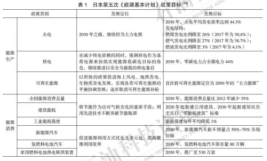 日本能源消費(fèi)高度依賴進(jìn)口,能源自給率低于10%,是發(fā)達(dá)國(guó)家中能源自給率最低的國(guó)家之一。日本能源轉(zhuǎn)型戰(zhàn)略的主要思路不拘泥于能源自給率,著力通過(guò)能源技術(shù)優(yōu)勢(shì)彌補(bǔ)資源稟賦的劣勢(shì),將能源技術(shù)能力作為保障能源安全、穩(wěn)定能源供給、優(yōu)化能源結(jié)構(gòu)和提高產(chǎn)業(yè)競(jìng)爭(zhēng)力的戰(zhàn)略性手段。2018年,日本發(fā)布了第五次《能源基本計(jì)劃》,提出了能源轉(zhuǎn)型戰(zhàn)略的新目標(biāo)、新路徑和新方向(表1)。