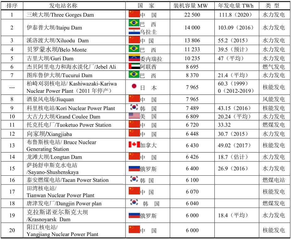 全球前20位發(fā)電站的順序是隨著時(shí)間而變化的,下表是最新的排序。目前全球20席中,中國(guó)占有八席:水力發(fā)電占有4席:三峽大壩、溪洛渡大壩、向家壩和龍灘大壩;燃煤發(fā)電占一席:托克托電廠;核能發(fā)電占一席:陽(yáng)江核電站。