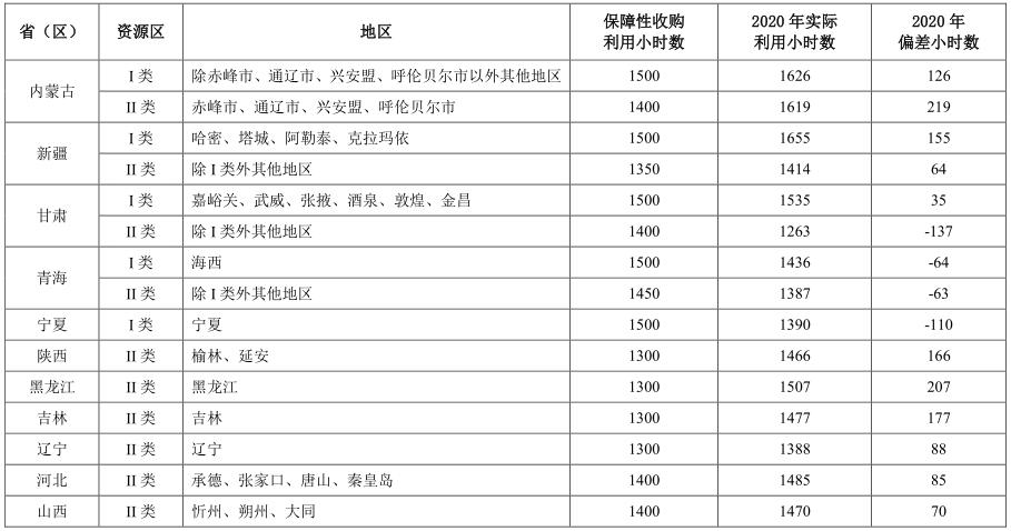 表3 2020年風(fēng)電重點地區(qū)最低保障收購年利用小時數(shù)落實情況