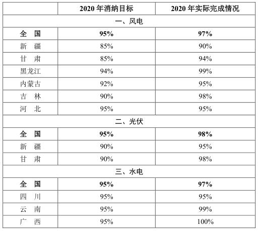 根據(jù)2018年國家發(fā)展改革委、國家能源局印發(fā)的《清潔能源消納行動計劃(2018-2020年)》(發(fā)改能源規(guī)〔2018〕1575號),所確定的分年度風(fēng)電、光伏和水電消納目標,2020年全國平均風(fēng)電利用率97%,超過2020年風(fēng)電利用率目標2個百分點,重點省區(qū)全部達到了2020年消納目標;全國平均光伏發(fā)電利用率為98%,超過2020年利用率目標3個百分點,重點省區(qū)全部達到了2020年消納目標;全國主要流域水能利用率97%,超過2020年利用率目標近2個百分點,重點省區(qū)全部達到了2020年消納目標。