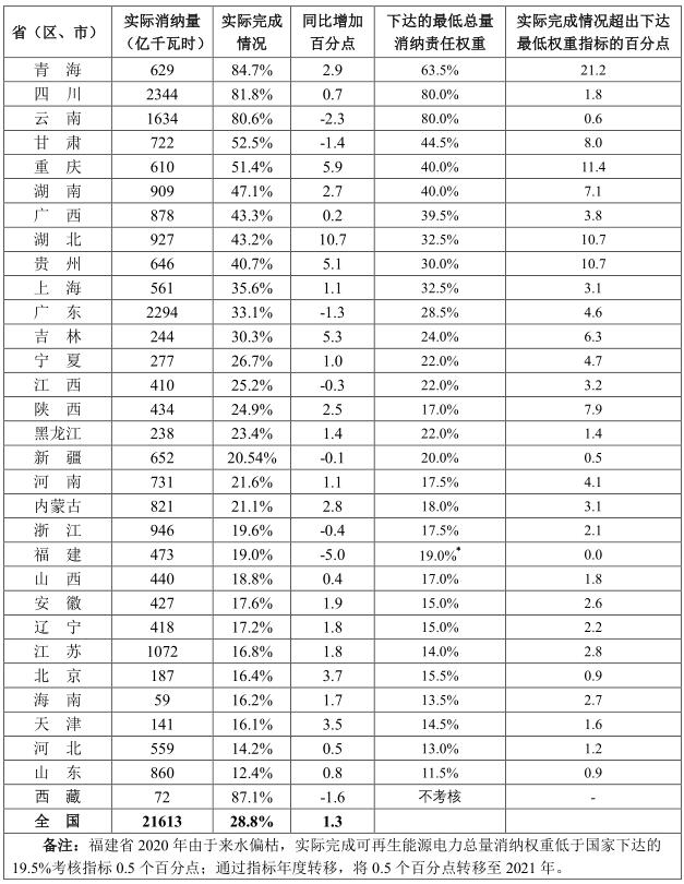 根據(jù)《國家發(fā)展改革委 國家能源局關(guān)于印發(fā)各省級行政區(qū)域2020年可再生能源電力消納責任權(quán)重的通知》(發(fā)改能源〔2020〕767號)公布的2020年各省(區(qū)、市)可再生能源電力消納責任權(quán)重,綜合考慮各省本地生產(chǎn)、本地利用以及外來電力消納情況,經(jīng)核算,除西藏免除考核外,全國30個省(區(qū)、市)都完成了國家能源主管部門下達的總量消納責任權(quán)重和非水電消納責任權(quán)重。